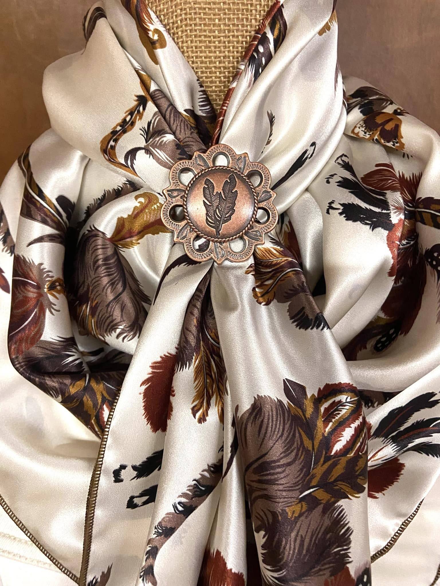 #25SILK - 100% SILK CHARMEUSE - Brown, Copper, Black and Gold Toned Feather Print on White $55